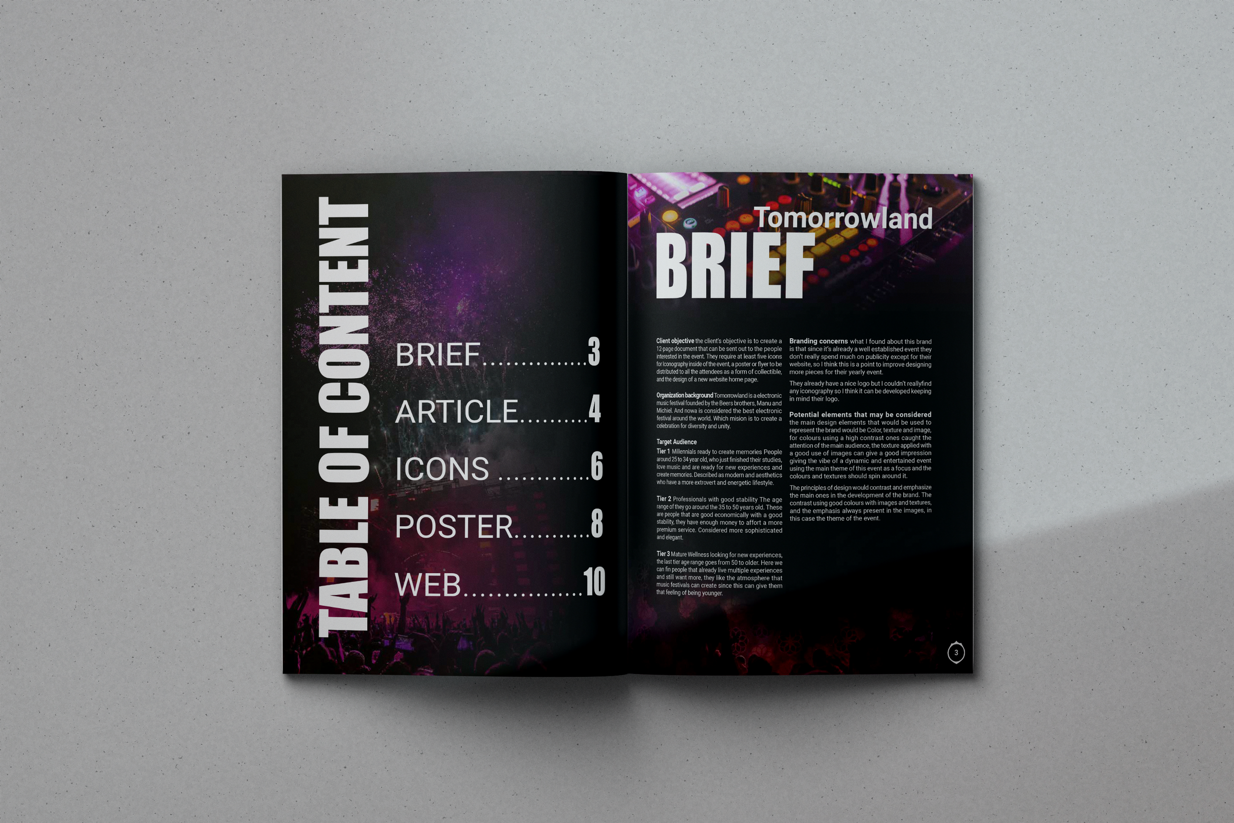 The magazine was designed not only to showcase our work in this project, but also to explain the rationale behind each one of them. Also, it serves to inform the audience about the event with some articles about Tomorrowland. The dimensions were letter size, 8.5 by 11 inches.